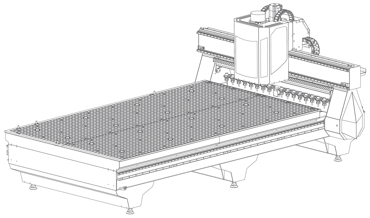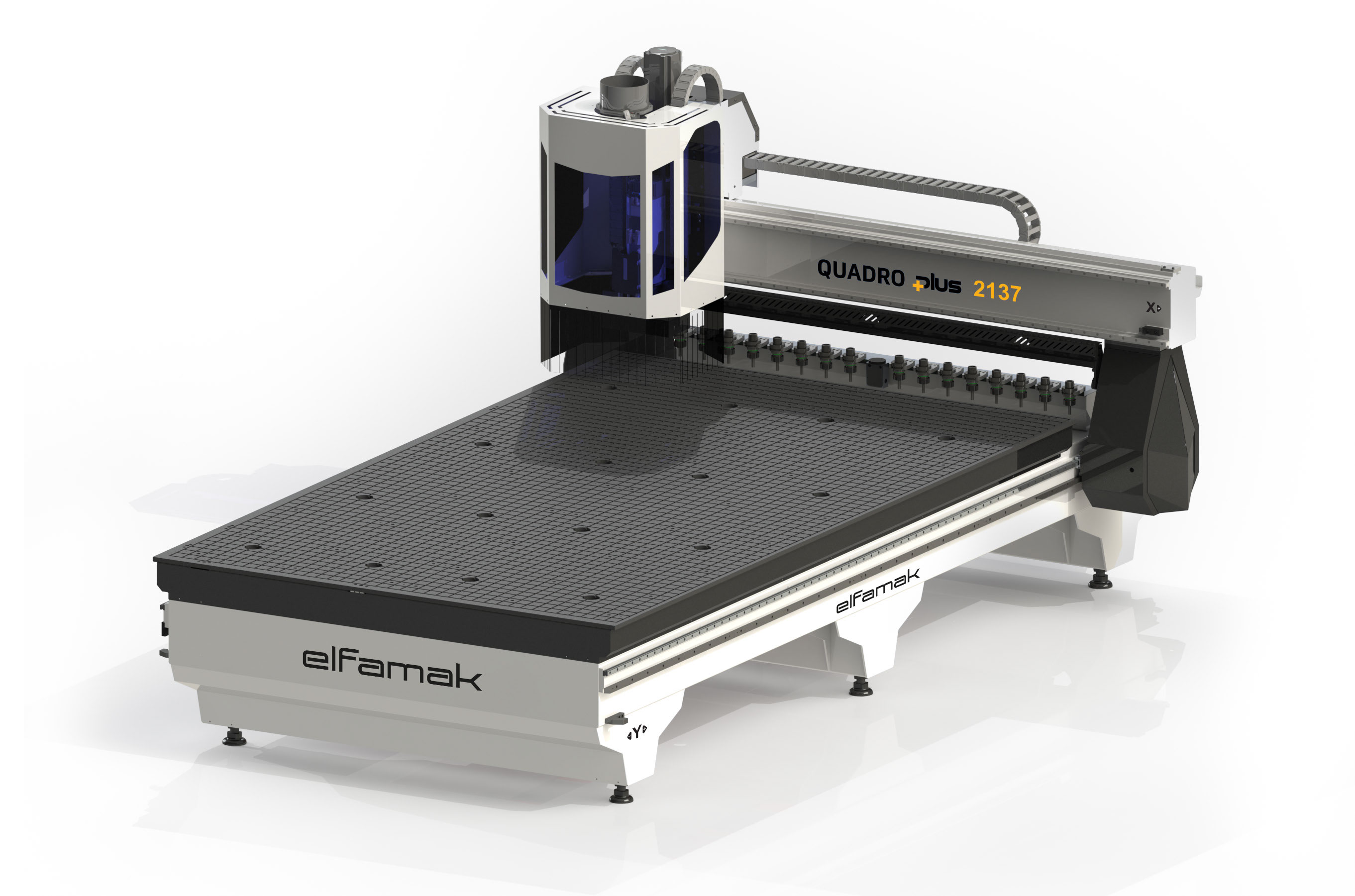 Quadro serisinde 12 takımlı sabit takım magazini kullanılmaktadır. Otomatik modda makina tüm takım değiştirme işlemlerini otomatik olarak yapar. Ayrıca kullanıcıdan bağımsız, otomatik olarak sistem takımın boyunu ölçer, hafızasına kaydedip bu takım boyunu kullanarak işlemine devam eder. İhtiyaç duyulması halinde ek olarak takım değiştirme işlemi operatör kontrolünde manuel olarak da yapılabilmektedir. Quadro’da bu özellik opsiyoneldir.